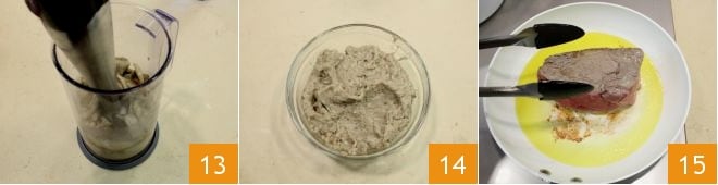 Once the necessary time has elapsed, turn off the heat, place the mushrooms in a rather tall glass 13, and blend them with an immersion blender until you obtain a smooth and homogeneous cream 14. Set aside the porcini mushroom cream you obtained and proceed to cook the meat: in a pan with hot oil, sear the rump well for 3 minutes on each side, turning it gently with tongs on all sides 15.