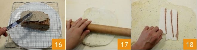 When the rump has taken on color, turn off the heat and place it on a rack with a dish underneath to collect the excess oil. With a knife, gently spread the rump with the mushroom cream evenly on all sides 16, except the underside; remember to keep some of the porcini mushroom cream aside as it will be used as an additional garnish. After the necessary time, remove the shortcrust pastry from the refrigerator, place it on a slightly floured work surface, and roll it out with a rolling pin 17 into a sheet 1-2 mm thick and of the necessary dimensions to cover the rump. At this point, you can proceed with the composition of the rump in crust: start by placing the lard slices in the center of the sheet one beside the other vertically, to cover the length of the rump 18;