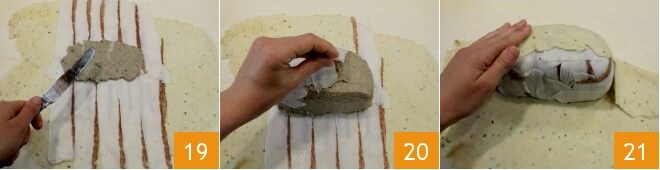 then overlap other slices to cover well the entire perimeter that will wrap the meat and then spread the remaining porcini cream on the central part. Place the meat on it 19 and start wrapping it with the lard slices, folding them gently until the whole surface is well covered 20. With your hands, wrap the shortcrust dough gently around the rump, trying to make it adhere as much as possible 21.