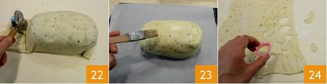 With a wheel or a knife, cut the excess pastry edges, which you will save for the final decorations 22, finally close the side parts well. Place the rump on a baking tray lined with parchment paper and brush the roll with a beaten egg to ensure the decorations adhere well 23. Then prepare the decorations by rolling out the leftover shortcrust pastry with a rolling pin and cutting out leaves with a cookie cutter 24;