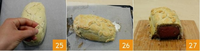 Complete by placing all the leaves on the crust surface 25 and brush them with the egg. Bake in a preheated static oven at 350°F for 30 minutes (or in a fan oven at 320°F for 20 minutes). Once ready and well golden 26, serve the rump in crust with lard and porcini hot 27.