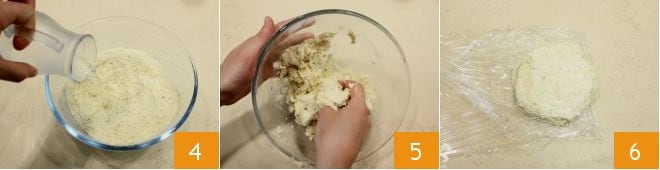 Place the mixture in a bowl, seasoning with salt and pepper. Add the ice-cold water gradually 4 and knead all the ingredients quickly with your hands to obtain a compact and smooth dough 5; then form a dough ball, flatten it slightly, and let it rest for at least 30 minutes in the refrigerator wrapped in cling film 6.