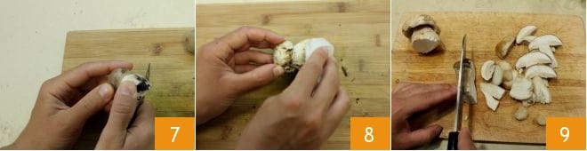 In the meantime, proceed to the How to Clean Porcini Mushrooms: with a sharp knife with a smooth blade, start removing the earthy part on the stem, scraping it gently to eliminate any trace of soil 7. If the mushrooms are quite clean, remove the few soil residues with a brush or a damp cotton cloth 8 (if they are still very dirty, quickly rinse them under a stream of cold running water). Once cleaned, cut the whole mushrooms lengthwise and set them aside 9.