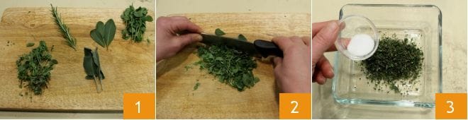 To prepare the herb chops with pumpkin and potatoes, start with the herb mixture 1 that will flavor the meat: finely chop the rosemary, sage, bay leaf, oregano, and marjoram 2; you will need a total of 0.88 oz of chopped aromatic herbs. Then pour the mixture into a small bowl, add salt 3 and pepper to taste.