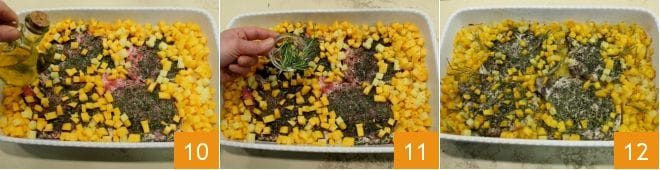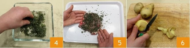 Mix the ingredients with your fingers 4 and coat the pork slices with this herb mix 5. Transfer them to a microwave-safe baking dish lightly oiled and set aside while you prepare the vegetables: peel the potatoes 6,