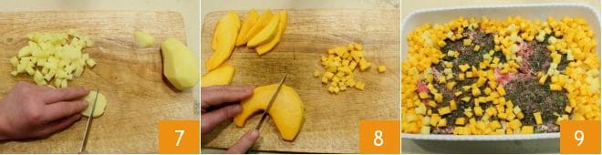 cut them in half and then into small cubes 7. Slice the pumpkin, remove the skin, and dice it into small cubes as well 8. Then arrange a layer of potato and pumpkin cubes over the chops in the baking dish 9.
