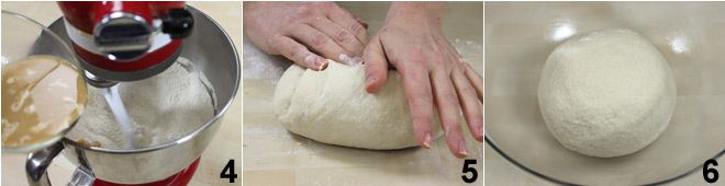 Put the flour in the bowl of a stand mixer equipped with a hook, turn on the machine and first add the yeast mixture 4 and then, little by little, the water, salt, and oil mixture. Knead until you get a smooth and elastic dough, then take it out of the bowl and, on a work surface, knead it for a few seconds to shape it into a sphere 5. Place the dough in a large bowl greased with a little olive oil 6, cover the bowl with plastic wrap and let it rise in a warm place for about two hours, until it doubles in volume.
