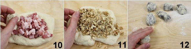 You should then have many small buns with bacon, olives, walnuts, rosemary, etc. Always set aside small quantities of ingredients to garnish the surface of the buns before baking. When you have formed all the buns, brush them with milk (or cream), put a little of the ingredient contained in the bun dough on top, and then let rise for about 30 minutes in the oven off but with the light on. When the buns have doubled in volume, they will be ready to be baked in a preheated oven at 390°F (200°C) for about 25 minutes.