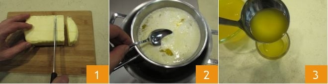 The first thing to do to prepare hollandaise sauce is to make clarified butter, so cut the butter 1 and let it melt in a bain-marie, being careful to skim it 2. Once it's purified from casein, you can transfer it 3.
