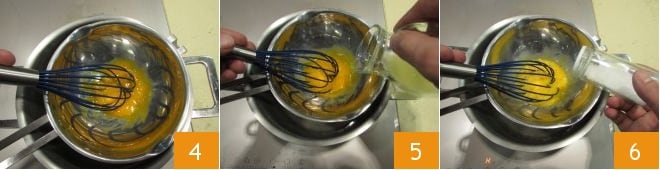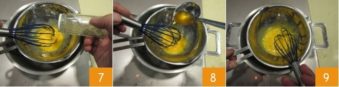 Meanwhile, prepare the sauce; it is very important that the cooking is in a bain-marie, so the water should not touch the saucepan and should never reach a boil. Pour the egg yolks into the saucepan and break them with a whisk 4, stir and add the lemon juice 5, then season with salt 6.