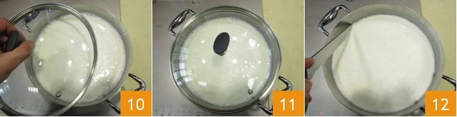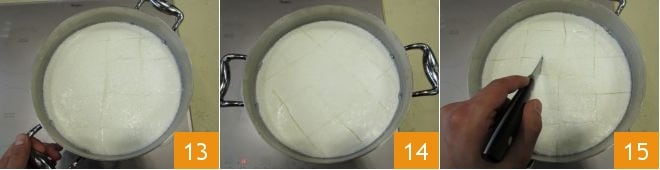 and cover with a lid 10 letting it rest for 50 minutes 11. After this time, you will notice that the mixture has set, so proceed with the first cut of the curd that has formed. Insert the blade of a rather long knife into the mixture obtained 12,