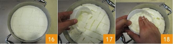 As before, you will need to cut the squares perpendicularly and let them rest for 15-20 minutes 16 then collect the curd with the molds (the special cheese molds) with a diameter of 5 inches and a depth of 3 inches 17; help yourself by pressing the curd with your hands to remove a good part of the whey 18.