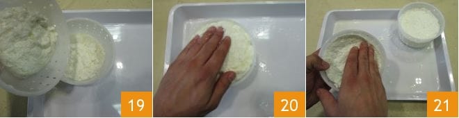 Fill the molds in several steps 19, always pressing with your fingers to remove as much whey as possible 20: with the obtained curd, you will fill 2 molds with a diameter of 5 inches and a height of 3 inches 21. Once filled and well pressed, wait 15 minutes;
