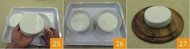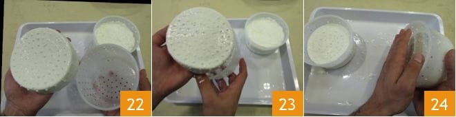 then flip the primosale onto your hand 22 and put it back in the mold but on the other side 23. Let it rest for another 15 minutes and then repeat the flipping operation 24. If you notice that the cheese is still soft, let it rest as long as needed to coagulate properly.