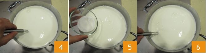 To prepare homemade primosale, start by pouring the milk into a pot 1 and let it gradually reach a temperature of 108°F, over medium heat 2, then turn off the heat and add the yogurt 3