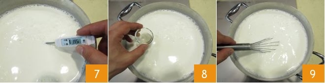 At this point, let the mixture cool to 100°F 7 and then pour in the rennet 8, stir briefly 9