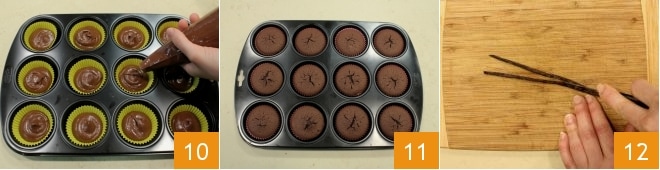 Transfer the batter into a piping bag with a smooth nozzle and squeeze it into the paper cups positioned inside a muffin mold 10. Bake the cupcakes in a preheated static oven at 350°F for 15 minutes (or convection oven at 320°F for 10 minutes). Once cooked, remove the cupcakes from the oven and let them cool 11. In the meantime, take care of the cream: cut the vanilla bean in half 12 and extract the seeds,