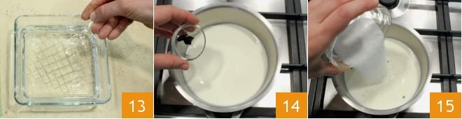 place the gelatin sheets in a bowl with cold water for about 10 minutes to soften them 13. Pour the milk into a saucepan and bring it to a boil, flavor with the vanilla bean seeds 14, add the sugar 15 and stir to dissolve it,