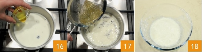then also add the honey 16, stir again to combine the ingredients, and after that, add the well-wrung gelatin sheets 17, stirring to dissolve them and thicken the cream, and then turn off the heat, transfer it to a bowl, cover it with cling film in contact 18 and let it cool. First, place it at room temperature and then in the fridge for at least a couple of hours so that it is well cold before adding the whipped cream. Before using it, it is advisable to smooth it by working it for a few moments with the whisk.