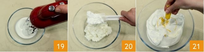 After two hours, take the fresh cream and whip it with electric whisks: it should be semi-whipped 19, incorporate the semi-whipped cream into the cold and smoothed cream with the whisks 20 and then take the yellow food coloring and add a few drops into the cream 21, just enough to get a bright yellow color.