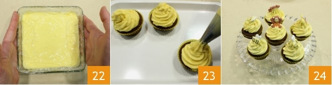 Cover the yellow cream with cling film in contact 22 and put it in the refrigerator to firm up for about two hours. When the cream is well firm and compact, transfer it into a piping bag with a star nozzle and cover the cupcakes with a generous dollop of cream 23. Finally, garnish the cupcakes with sugar decorations of your choice 24 or even colored sugar balls. The honey-decorated cupcakes are ready to enjoy!