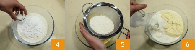 In a separate bowl, pour the flour, cornflour, then also add the baking powder and a pinch of salt 4; sift the powders into the bowl containing the butter, sugar, and egg mixture 5 and mix with a wooden spoon to combine the ingredients, then add the room temperature milk 6,