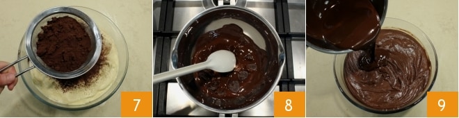 stir and finally add the unsweetened cocoa powder 7. In a saucepan for a bain-marie, melt the chopped dark chocolate 8, add it to the mixture and mix to obtain a homogeneous batter 9.