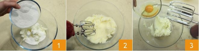 To make the honey-decorated cupcakes, start by preparing the basic batter: place the softened butter pieces and sugar in a bowl 1 and work the mixture into a cream 2; add the egg 3 and continue to mix the ingredients until you get a light and fluffy mixture.
