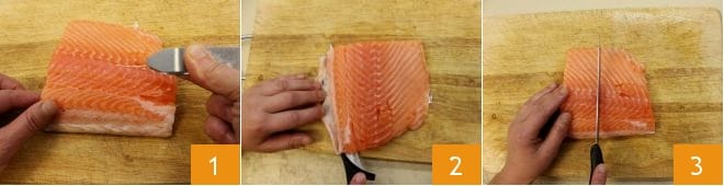 To prepare the honey-glazed salmon, start by cleaning the fish. Run your fingertip along the salmon flesh to check for any remaining bones, and remove them with kitchen tweezers if necessary 1. Cut the thicker part of the fillet 2, remove the skin, and then divide the salmon into 4 fillets of approximately 5 oz each 3.