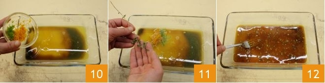 Add the grated citrus zest 10 along with thyme leaves 11; season with salt and pepper to taste, then mix well with a fork 12.