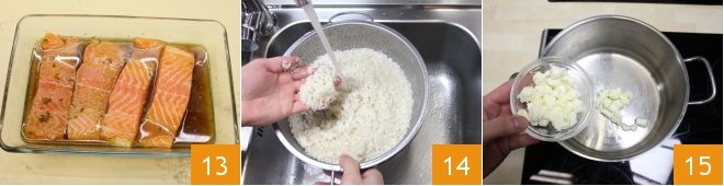 Place the salmon fillets side by side in the marinade 13 and refrigerate to marinate for about 30 minutes, covered with plastic wrap. Meanwhile, you can prepare the pilaf rice: bring a pot of salted water to a boil (which will be used to prepare the Vegetable broth) and meanwhile, rinse the rice several times under cold running water to remove the starch 14. In a large pot, melt the butter cut into pieces 15.