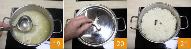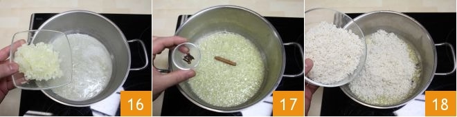 and sauté the finely chopped onion for at least 8-10 minutes 16. When the onion becomes translucent (it should not brown), add the cinnamon and cloves 17. Sauté for 2 minutes, then add the washed and drained rice 18, toasting it for another 5 minutes.