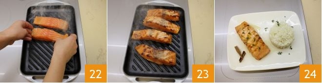 At this point, heat the grill pan very well, then cook the salmon fillets, turning them on each side for about 1 to 1.5 minutes 22, so they remain crispy on the outside and tender and pink on the inside. Once ready 23, place the salmon fillets on a serving plate and plate the pilaf rice using an 8 cm (about 3 inches) mold; finally, you can serve and enjoy the honey-glazed salmon 24.