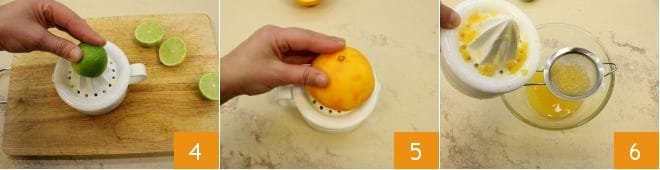 Then proceed to prepare the marinade: squeeze the lime 4 and the orange 5 and strain the juice of both with a strainer 6.