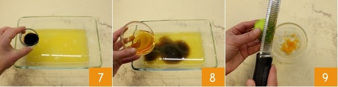 In a large, shallow baking dish, pour the citrus juice, soy sauce 7, honey 9, and oil. Grate the lime and orange zest 9.