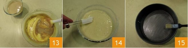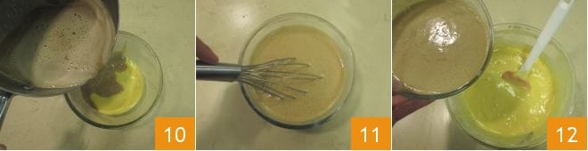 Pour the hot milk and coffee mixture into the bowl with the spoonfuls of batter you set aside earlier 10. Stir carefully with a whisk; you will get a sort of batter 11. Now pour this batter little by little into the larger bowl with the rest of the mixture 12,