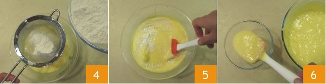 Sift the flour and baking powder into the same bowl 4, adding them gradually while mixing with a spatula from the bottom up 5, so as to incorporate them without deflating the mixture. Now take a couple of tablespoons of batter and set them aside in another bowl 6.