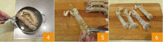 There are several methods to clean mantis shrimp. Depending on the use, the method varies. First of all, in any case, you must wash the live shrimp under running water 1, being careful not to injure yourself with their spiny tails. To prepare pasta sauces or flavorful soups, it will be sufficient to cut them into pieces with a sharp knife. To cook them whole 2, you will need to make a cut along the dorsal shell so that the meat absorbs flavors more easily during cooking. If you wish, you can completely free the mantis shrimp from the dorsal shell, keeping only the meat, to make it easier for your guests or for particular preparations. In this case, to simplify the operations, dip them for just 2 minutes in a pot full of boiling water 3.