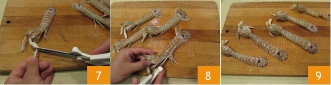 With the scissors, also remove the tips of the claws 7 to avoid being pricked while handling them. Remove the portion of the dorsal shell that slightly protrudes along the side of the crustacean (8-9).