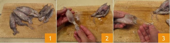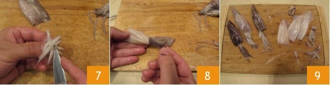 Using a knife, remove it 7. Finally, cut the mantle with a knife and peel the squid's skin 8. Repeat the operation for the tentacles as well. Rinse all parts of the fish under running water, and the squid will be ready for your preparations 9.