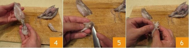 Next, extract the squid's innards 4 and rinse it. At this point, take the fish's head again. Hold it steady with two fingertips and, using a knife, cut around the eyes with a knife 5 and by pressing the lower part of the eyes, remove them. Also, locate the beak found in the center of the tentacles 6 and push it outward.