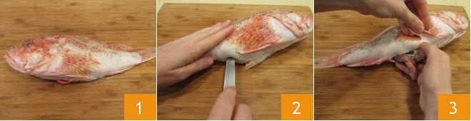To clean the scorpionfish 1, first open it by slicing the belly with a knife: start from the head and cut all the way down to the tail 2, taking care not to damage the flesh, then remove the entrails 3.