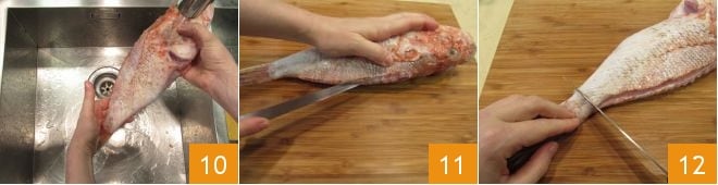 Then rinse thoroughly under running water to remove any remaining scales 10, make a cut with a sharp knife along the back 11, and make an incision near the caudal fin 12 to facilitate filleting the scorpionfish.