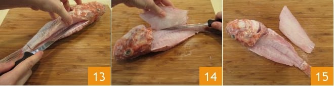 Start filleting by opening the scorpionfish with your hands while sliding the blade 13 to detach the first fillet 14 and set it aside 15 for any preparations. Do the same on the other side. This way, you will have obtained the scorpionfish fillets useful for your preparations. If necessary, you can remove the skin by cutting it off with a sharp knife, sliding it between the skin and the flesh along the entire length of the fillet.