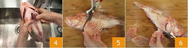 Once the entrails are removed, rinse the scorpionfish well under a stream of fresh water 4 to remove any residues. Proceed to cut all the fins: with scissors, cut the pectoral fin 5, the ventral fin 6,
