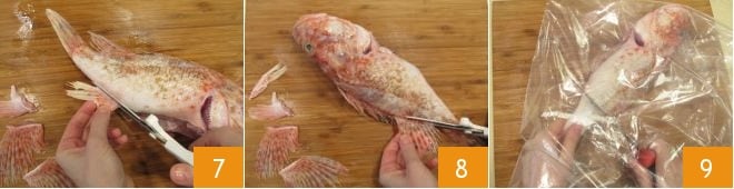 the lower belly fin 7, and the dorsal fin 8. Then, scale it with a knife, starting from the tail and moving towards the head, inserting it into a plastic bag 9 to prevent the scales from scattering.