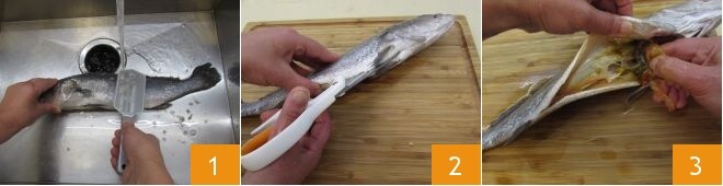 Wash the fish's belly thoroughly to remove the bitter taste 4. Then proceed to fillet the shi drum: with a sharp-bladed knife, cut along the back of the fish, corresponding to the line of the dorsal fins 5. The cut must be made deeply, down to the fish bone to separate the meat from the central bone 6.