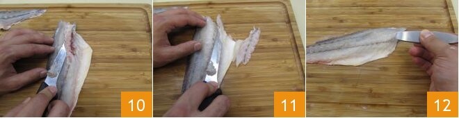 Using a small knife, remove the reddish nerves located in the central part of each fillet 10. Now gently remove the visible bones from the fish's belly with a knife 11, being careful not to break the meat. Proceed by removing the remaining bones with a pair of tweezers 12. Your shi drum fillets are now ready to be used.