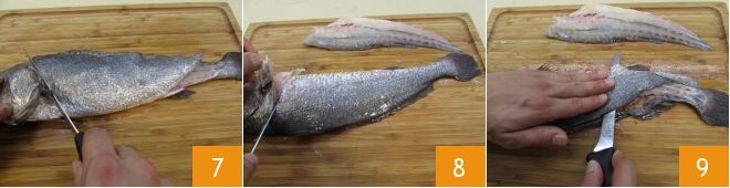 Then proceed by separating the fillet from the head of the animal 7 making a sharp cut at the gills. For this operation, it is preferable to slightly angle the knife 8. Then proceed on the other side of the fish to obtain the second half of the fillet by detaching the meat from the bone 9.