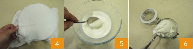 Cover with a clean dish towel or cheesecloth 4 and let rest at room temperature for 24 hours. After this time, take your sour cream, stir it quickly with a spoon 5, and transfer it into a glass jar 6: it will be ready to use in your recipes!